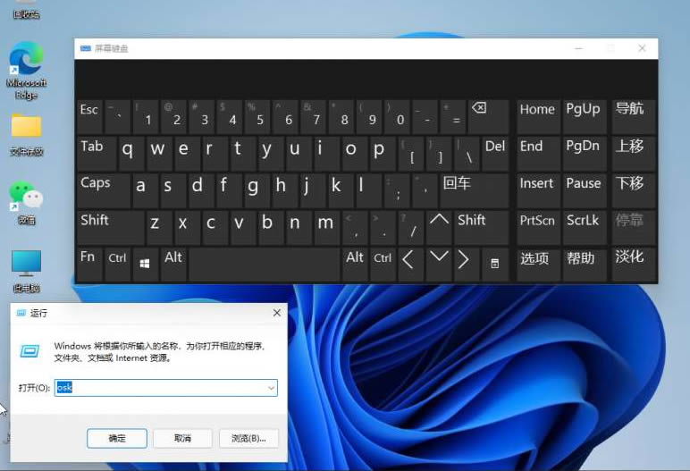 6、或者按住键盘快捷键win+r,然后输入osk也可以打开。