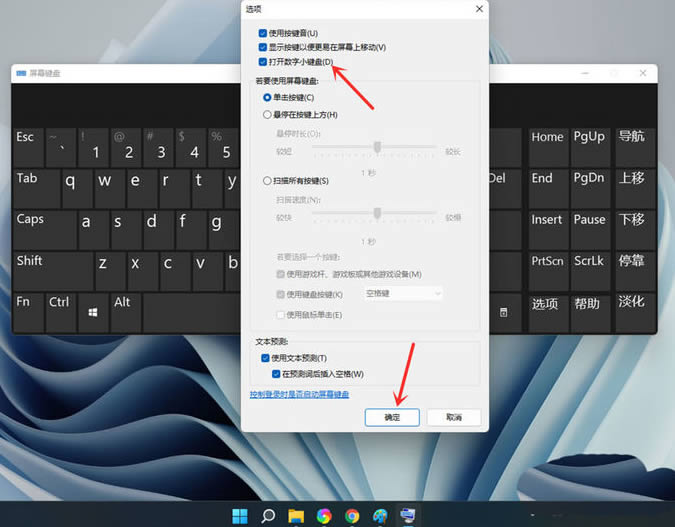 4、打开数字小键盘,勾选【打开数字小键盘】,点击【确定】。