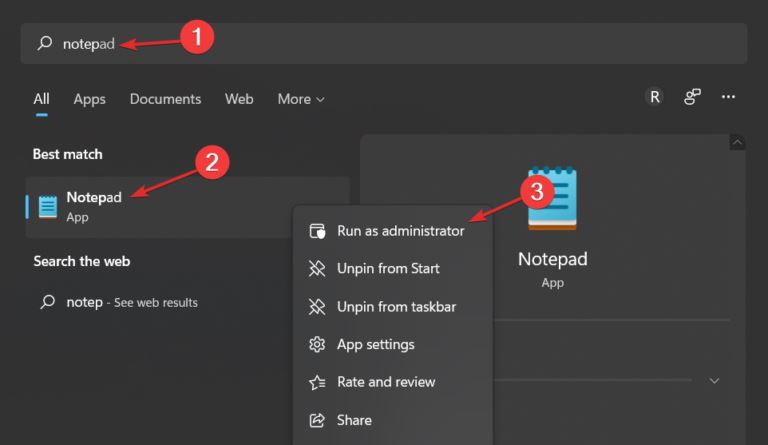 打开搜索框并输入记事本。右键单击顶部结果并选择run as administrator。
