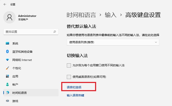 2、在高级键盘设置界面点击【语言栏选项】打开。