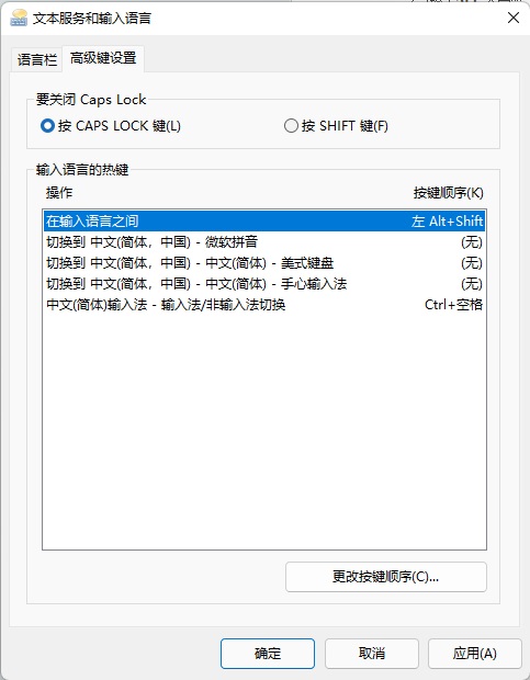 3、在文本服务和输入语言窗口选择【高级键设置】,可以看到要关闭Caps Lock的按键设置,可能用户之前设置为shift键了,这里改为按CAPS LOCK键,这样开启和关闭大小写都是同一个按键。