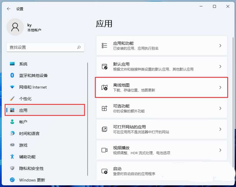 3、设置窗口,左侧边栏,点击应用,右侧点击离线地图(下载、存储位置、地图更新);