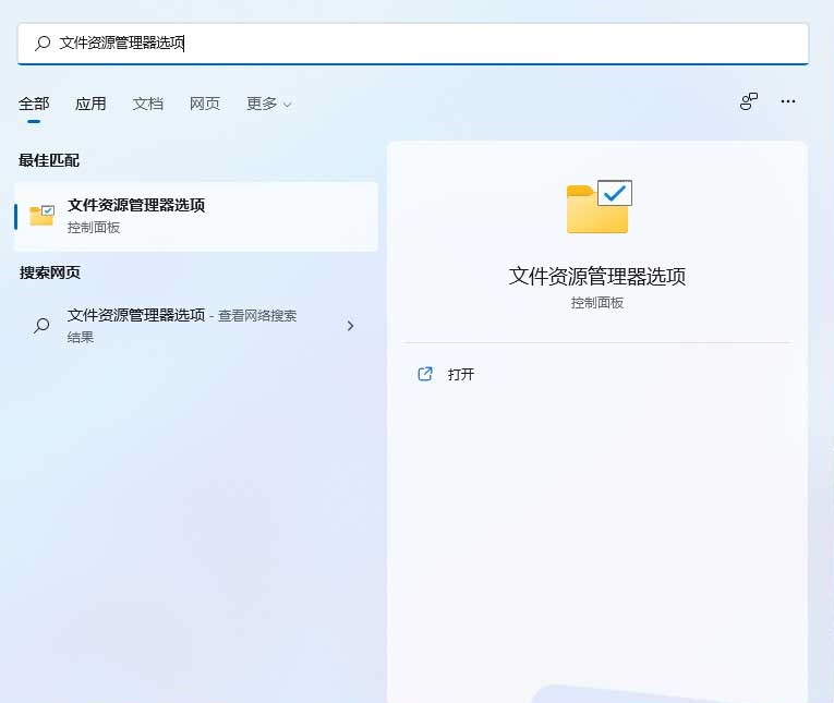 按 Win + S 组合键,打开系统搜索,输入文件资源管理器选项,然后点击打开系统给出的最佳匹配文件资源管理器选项控制面板。