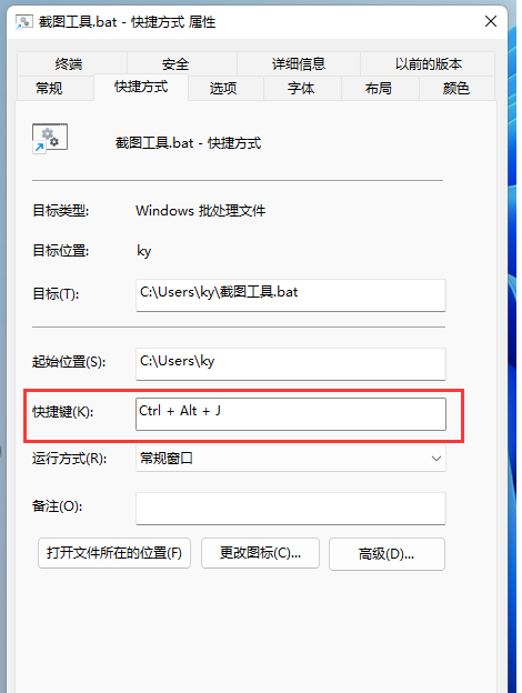 6、截图工具.bat - 快捷方式 属性窗口,点击快捷键(K),然后按键盘上的键即可,这里我设置的快捷键为:Ctrl + Alt + J;