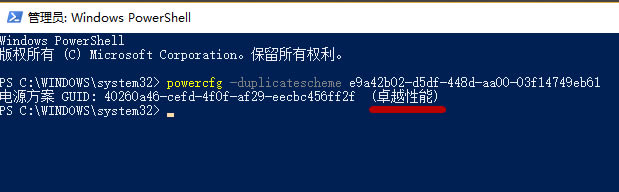 powercfg -duplicatescheme e9a42b02-d5df-448d-aa00-03f14749eb61后回车。