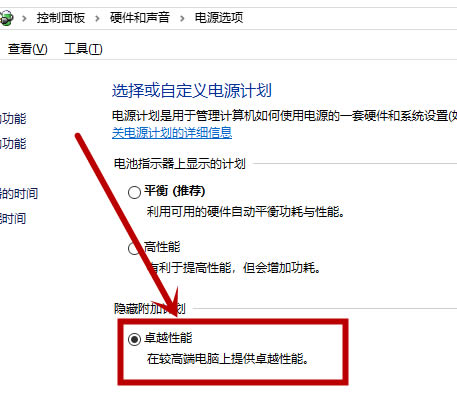 6、在打开的“电源选项”界面,点击“显示附加计划”,就会出现“卓越性能”选项,点击此项就行了。