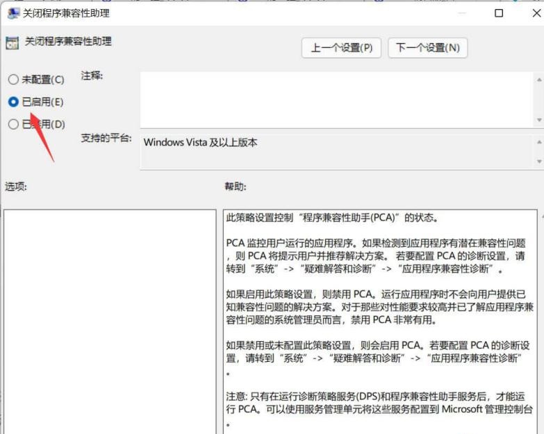关闭程序兼容性助理窗口,选择已启用,再点击底部的应用-确定按钮即可。