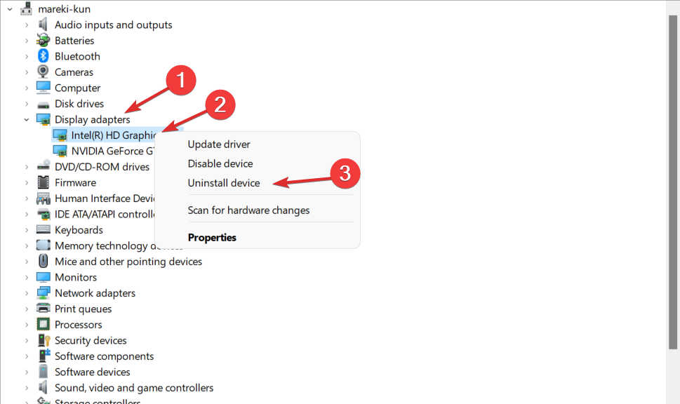现在展开显示适配器部分并右键单击其中的每个选项以选择卸载设备,如下所示。