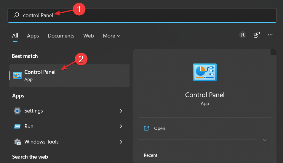 打开Windows 搜索功能并进入控制面板,然后单击最上面的结果。