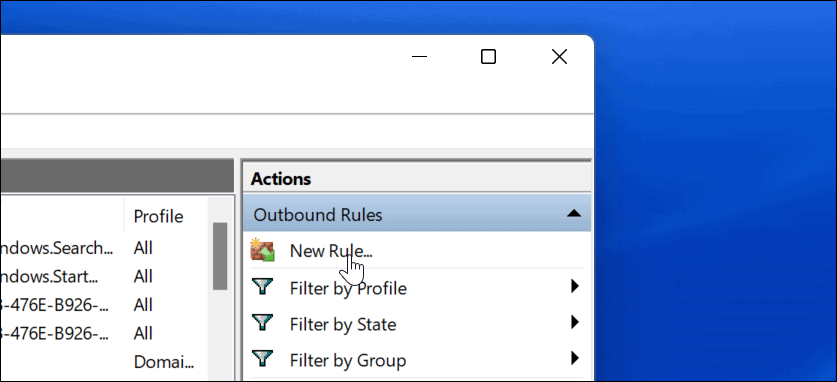 从左侧面板中选择Outbound Rules,然后在右侧单击Actions下的New Rule。