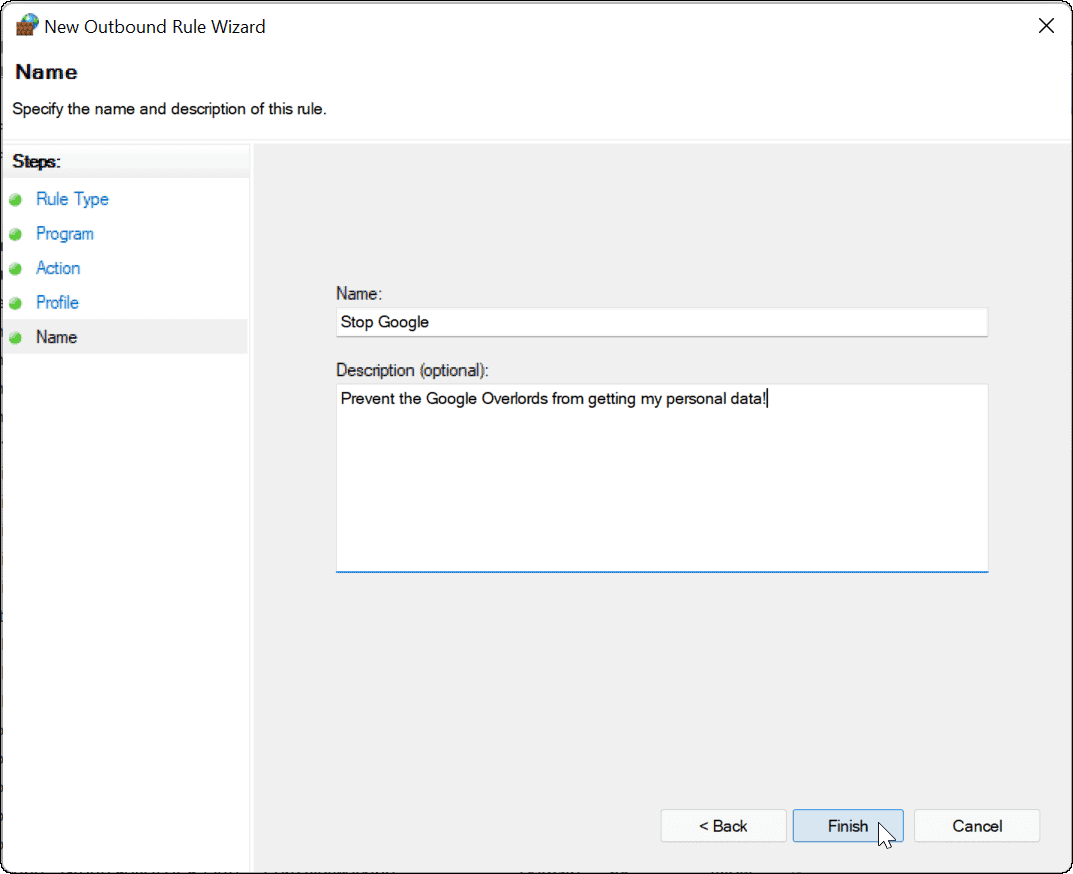 输入防火墙规则的名称,例如Block Google并添加说明。规则的名称是必需的,但描述是可选的。完成后,单击完成 按钮。