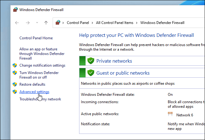 当Windows Defender 防火墙窗口打开时,单击左侧的高级设置。