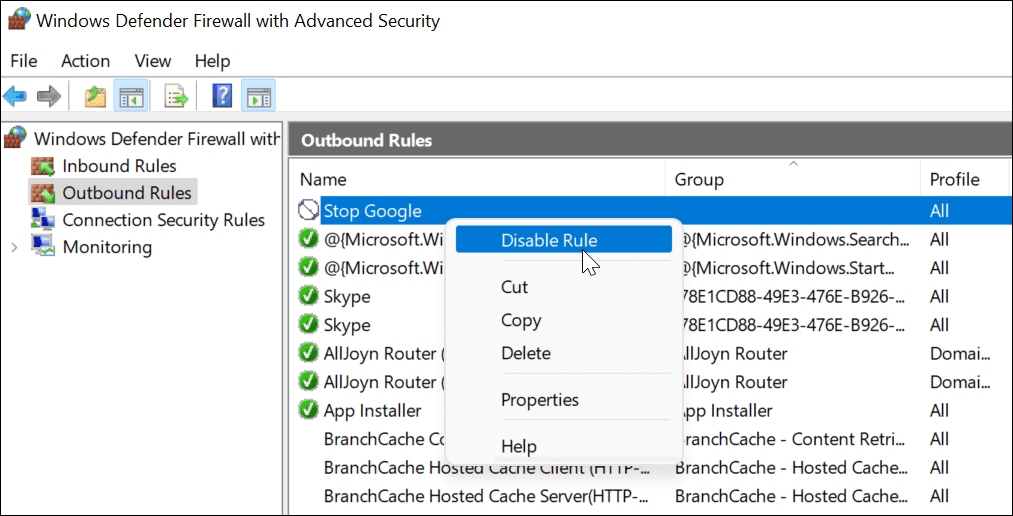 如果您阻止了某个应用程序访问 Internet,但又想授予访问权限,则可以。您需要在之前创建的 Windows Defender 防火墙菜单中禁用出站规则。