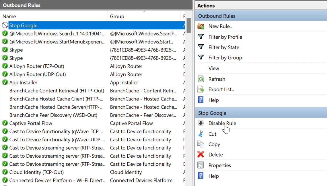 您还可以选择您创建的出站规则,然后从右侧的“操作”窗格中禁用或删除它。