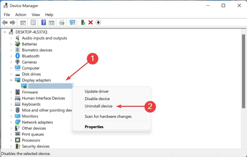 如果当前安装的驱动程序损坏,Nvidia 驱动程序将在 Windows 11 中不断崩溃。损坏的驱动程序在设备管理器中其图标的左下角附近有一个警告标志,这有助于轻松识别这些。
