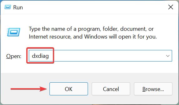 按Windows+R启动运行命令,在文本字段中输入dxdiag,然后单击OK或点击Enter启动DirectX 诊断工具。