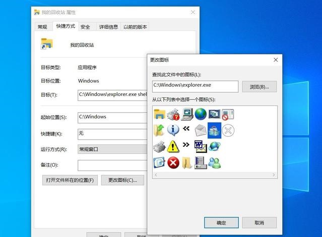 快捷方式显示的是文件资源管理器图标,但是,你可以将该图标更改为更合适的回收站图标。为此,请右键单击桌面快捷方式并选择属性,然后按更改图标按钮打开一个窗口。