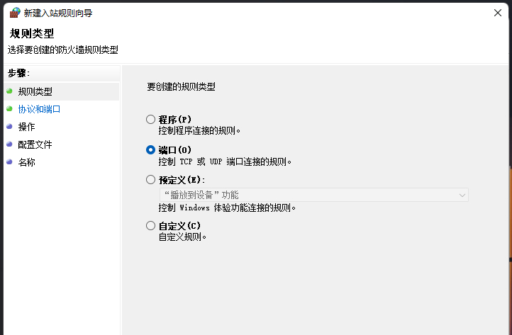 5、新建入站规则向导,点击端口(控制 tcp 或 udp 端口连接的规则),然后点击下一页;
