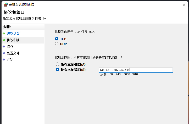 6、选择特定本地端口,输入135,137,138,139,445,中间用逗号隔开,注意这里的逗号是英文的逗号,然后点击下一页;