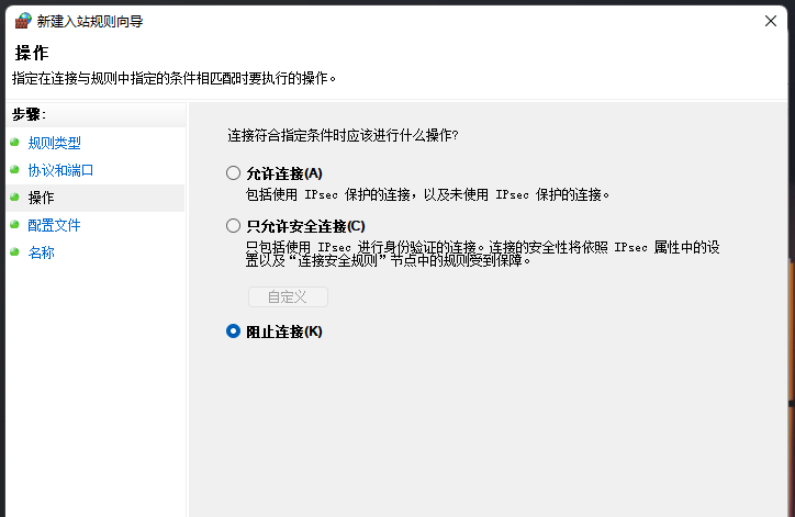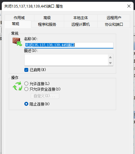 11、关闭135,137,138,139,445端口 属性,点击最底下的阻止连接;