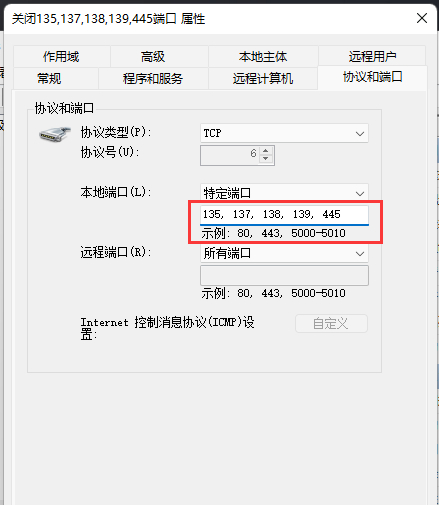12、切换到协议和端口选项卡,阻止连接的本地端口是之前设置的135,137,138,139,445,说明网络端口135,137,138,139,445已经被阻止连接;