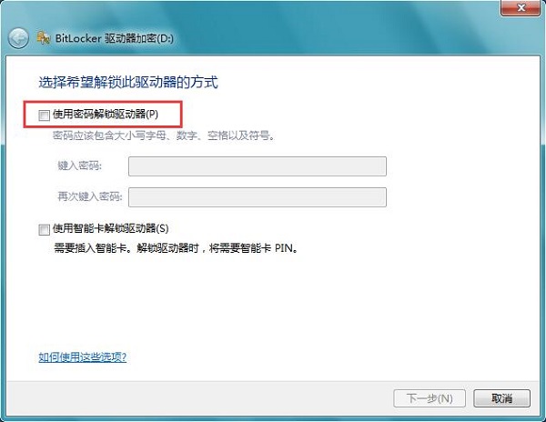 2、勾选使用密码解锁驱动器,这时会提示键入密码。