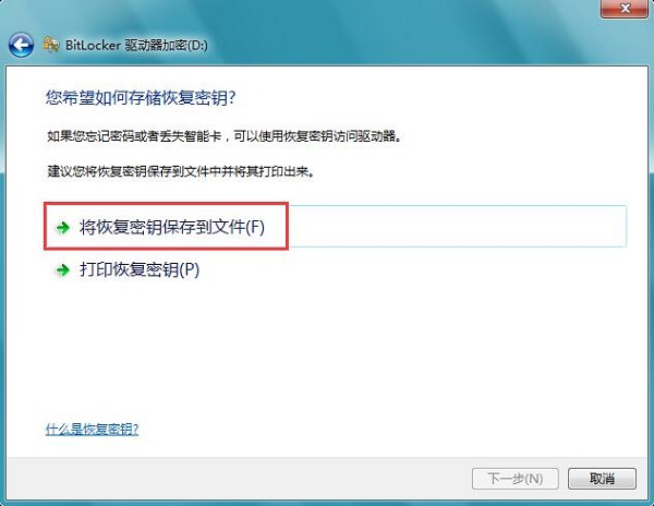 4、为了防止你的密码被忘记或者丢失,系统会提示保存回复密钥的方式,按照自己喜好的方式保存密钥,可以保存在U盘,也可以保存在网盘或云盘上,就是不适合保存在本机上。