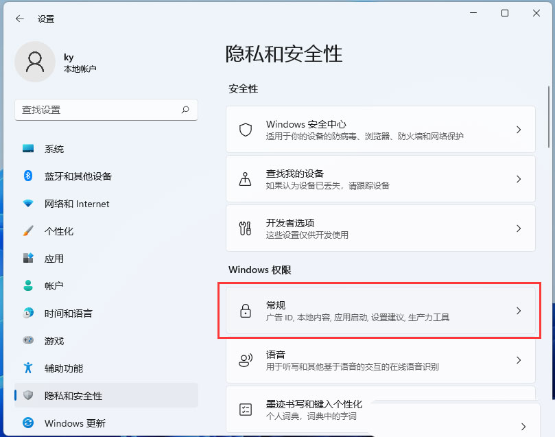 4、隐私和安全性下,找到windows 权限,再点击常规(广告 id,本地内容,应用启动,设置建议,生产力工具);