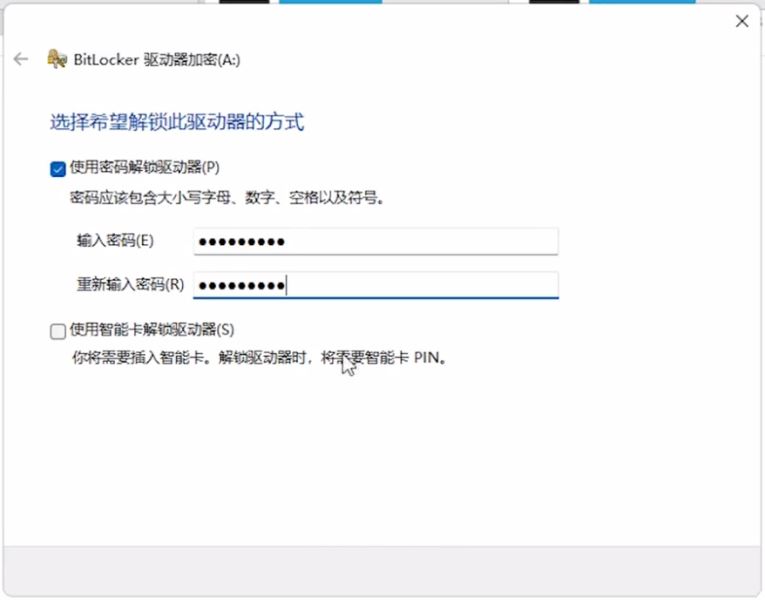 3、选择希望解锁此驱动器的方式,可以选择使用密码解锁驱动器或使用智能卡解锁驱动器,我们这里采用选择使用密码解锁驱动器,然后输入密码后点击下一步,如下图所示;