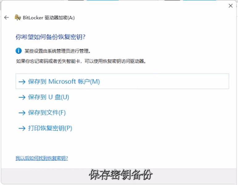注意:切记保存好 bitlocker 备份恢复密钥,如丢失,则您大概会永久丢失对文件的访问权限!