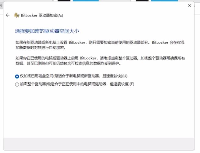5、选择要加密的驱动器空间大小,如果在新驱动器或新电脑上设置 bitlocker ,则只需要加密当前使用的驱动器部分,bitlocker 会在你添加新数据时对其进行自动加密。