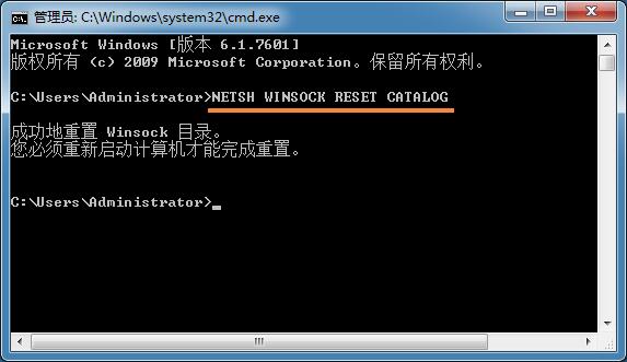 5、在Dos窗口中输入NETSH WINSOCK RESET CATALOG,按回车键执行,显示Winsock目录重置成功,必须重新启动。