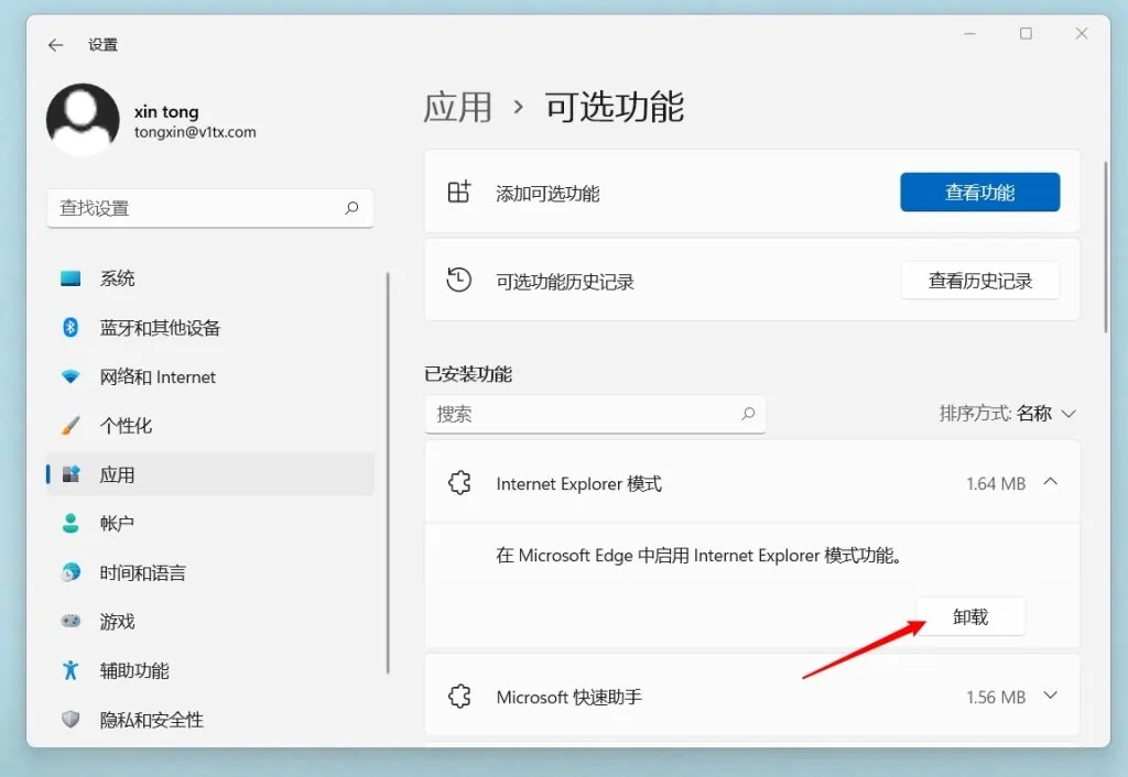 在可选功能设置中找到想要删除的功能,然后点击下方的卸载即可移除该可选功能。