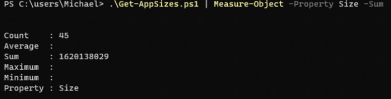 如下图所示,使用 PowerShell 提供的查询功能,我们能够计算出 Windows 11 默认应用的大小。这些应用已按大小(以字节为单位)降序排序,可以看到 Microsoft Teams 是最大的应用,占用了大约 91MB 的空间。