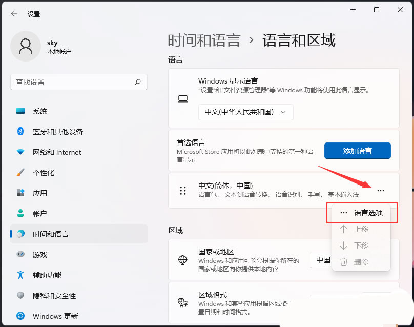 4、点击中文简体右侧的三个小点,然后选择语言选项;