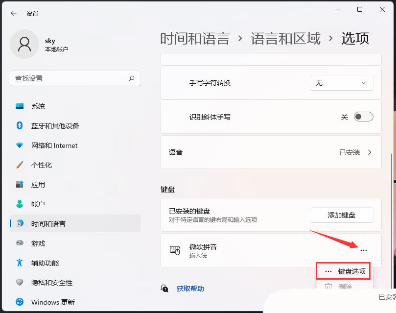 5、键盘下,找到微软拼音输入法右侧的三个小点,然后选择键盘选项;