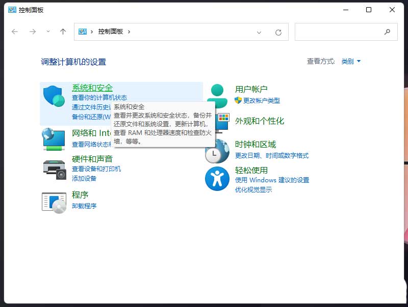 3、控制面板窗口,类别查看方式,点击调整计算机的设置下的系统和安全;