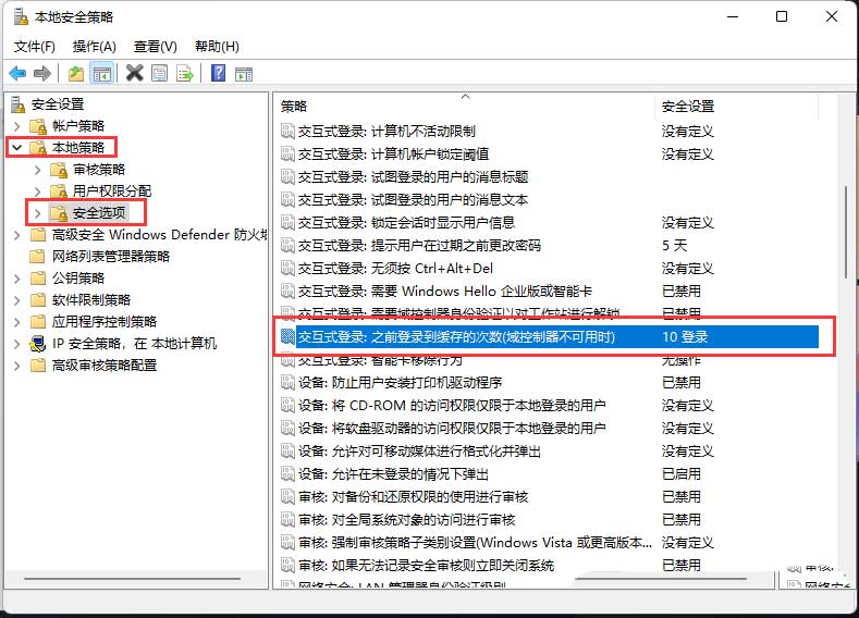 6、本地安全策略窗口,左侧展开到:本地策略 》 安全选项,右侧找到并双击打开“交互式登录: 之前登录到缓存的次数(域控制器不可用时)”;