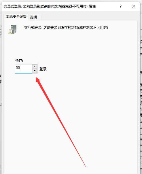 7、交互式登录: 之前登录到缓存的次数(域控制器不可用时) 属性下,将缓存改为50;