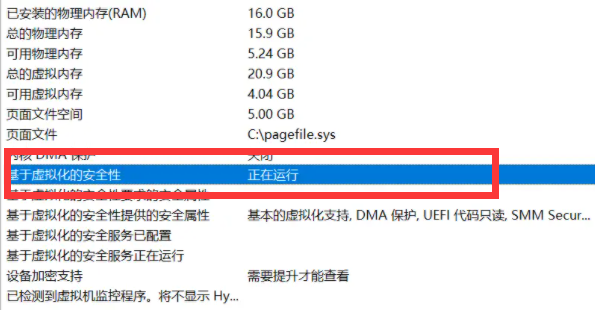 2、在弹出的“系统信息”窗口中,向下滚动列表,可以看到“基于虚拟化的安全性”项目,即为 VBS 功能。下图可见,该功能正在运行。