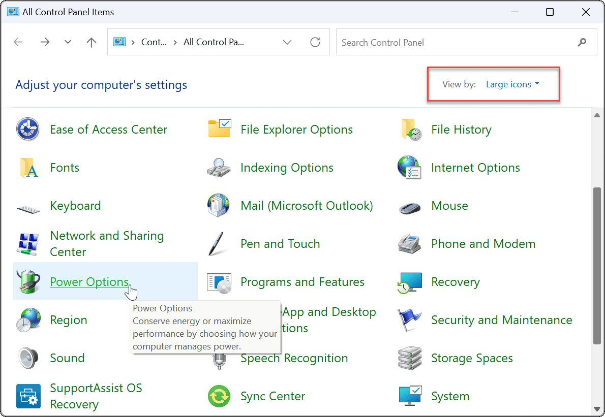 在控制面板中,将查看方式选项更改为大图标,接下来,选择电源选项。
