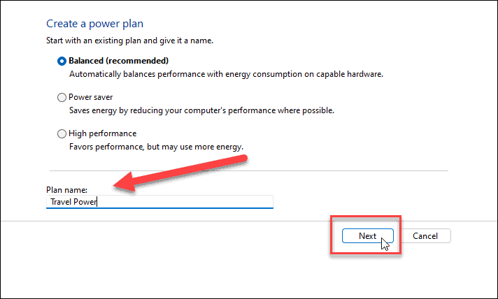 从提供的选项中选择您要使用的基本电源计划,在底部的计划名称字段中为其指定一个描述性名称,单击下一步。