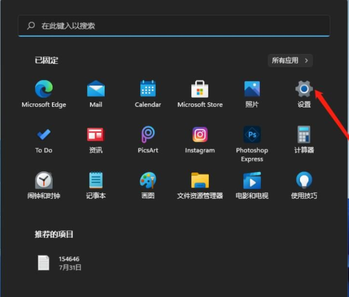 1、按 Win 键,或点击任务栏上的开始,在打开的应用中,点击打开设置。