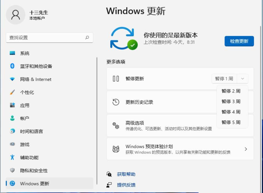 3、Windows 更新更多选项下,就可以设置暂停更新,最短可选暂停 1 周,最长可选暂停 5 周。