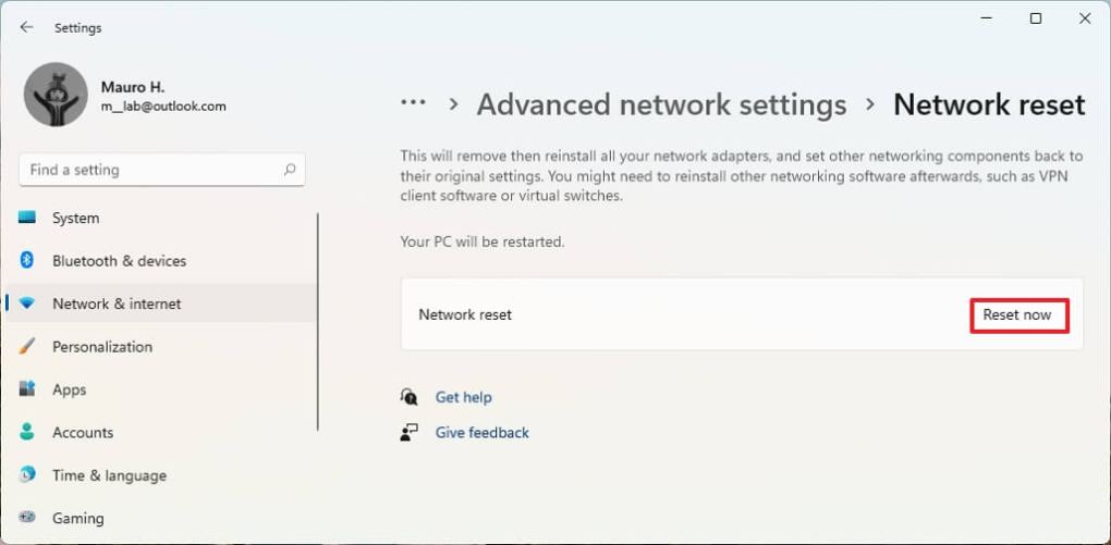 注意:您不能选择特定的Wi-Fi或以太网适配器。此功能将自动删除并重新安装您的所有网络适配器。完成该过程后,您可能需要重新安装或重新配置其他网络软件,例如VPN客户端软件。