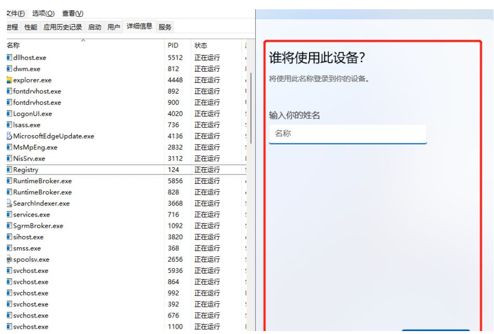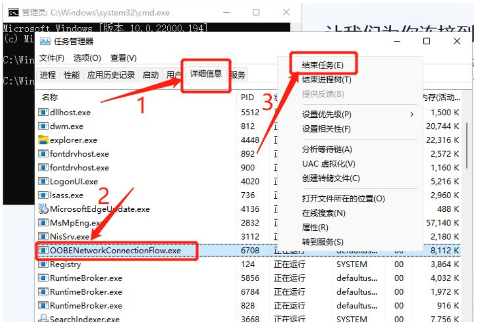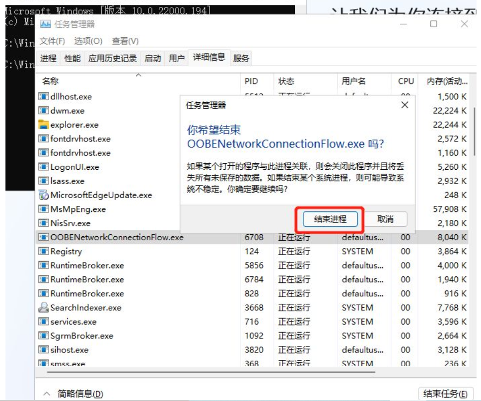 2、我们在进入到这个需要联网才能进行下一步的操作页面中,按住Shift,F10,弹出命令提示符的窗口,我们只要在此输入taskmgr,进入到任务该管理器当中,找到左侧的详细信息功能。
