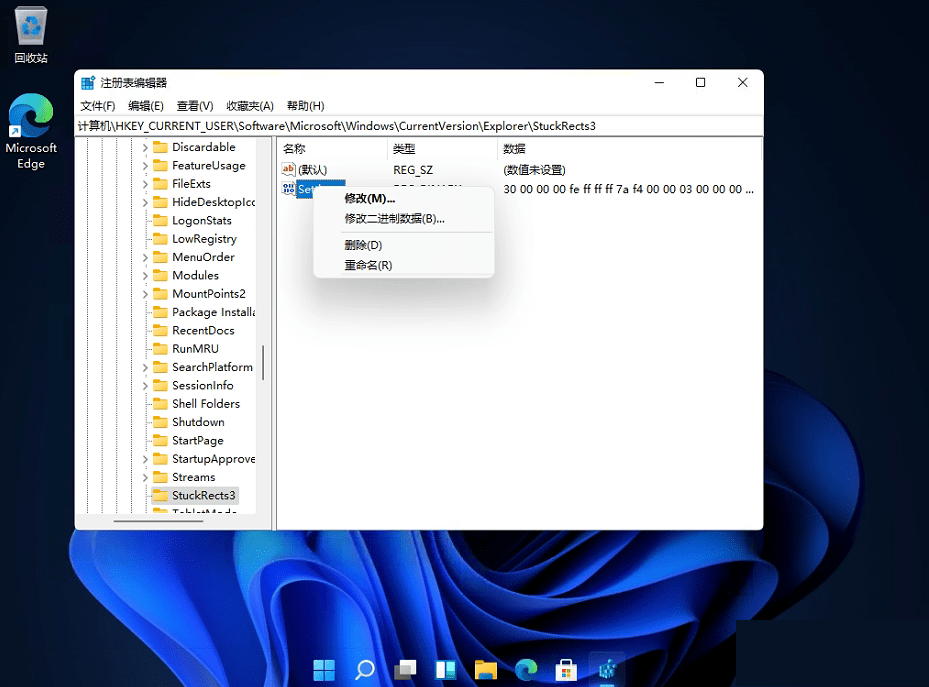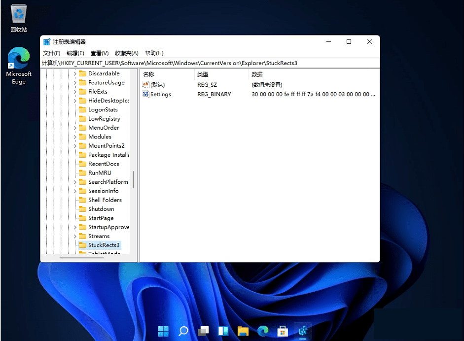 3、 然后定位到这里:HKEY_CURRENT_USERSoftwareMicrosoftWindowsCurrentVersionExplorerStuckRects3。