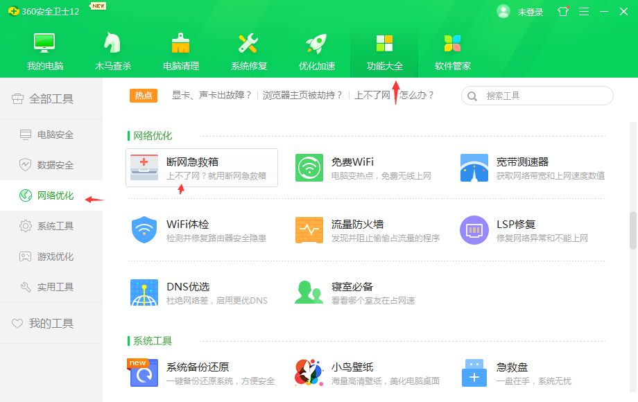 1、下载安装360安全卫士,在360安全卫士中找到功能大全 - 网络优化 - 断网急救箱并打开。
