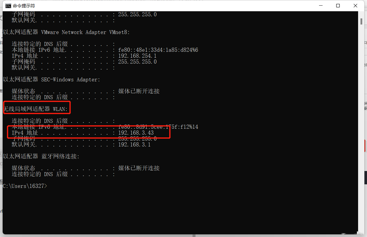 4、查看公共共享打印机的ip地址,使用命令“ipconfig”。