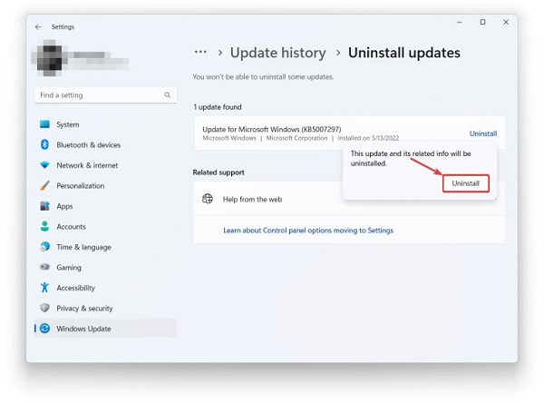 5、通过单击新弹出窗口上的“卸载”来确认删除 Windows 11 更新。
